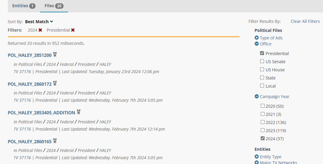 5. The results, which appear in the image above in the space under BEST MATCH, will bring up PDFs of the actual contracts the political ad buyer made with the TV station. Opening any one of these will reveal the price paid for an ad (or groups of ads) during special times on that station.